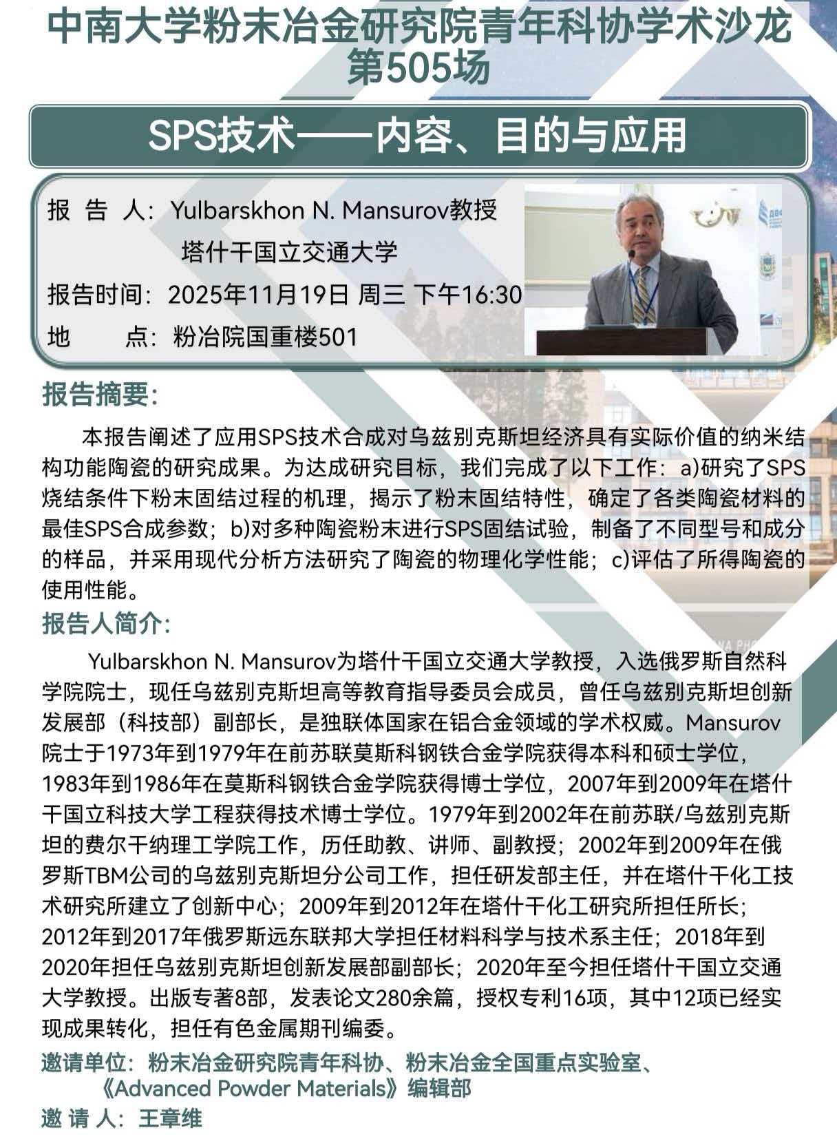 Yulbarskhon N.Mansurov为塔什干国立交通大学教授,入选俄罗斯自然科成人app院士,现任乌兹别克斯坦高等教育指导委员会成员,曾任乌兹别克斯坦创新发展部(科技部)副部长,是独联体国家在铝合金领域的学术权威。Mansurov院士于1973年到1979年在前苏联莫斯科钢铁合金成人app获得本科和硕士学位,1983年到1986年在莫斯科钢铁合金成人app获得博士学位,2007年到2009年在塔什干国立科技大学工程获得技术博士学位。1979年到2002年在前苏联/乌兹别克斯坦的费尔干纳理工成人app工作,历任助教、讲师、副教授:2002年到2009年在俄罗斯TBM公司的乌兹别克斯坦分公司工作,担任研发部主任,并在塔什干化工技术研究所建立了创新中心;2009年到2012年在塔什干化工研究所担任所长;2012年到2017年俄罗斯远东联邦大学担任材料科学与技术系主任:2018年到2020年担任乌兹别克斯坦创新发展部副部长;2020年至今担任塔什干国立交通大学教授。出版专著8部,发表论文280余篇,授权专利16项,其中12项已经实现成果转化,担任有色金属期刊编委。