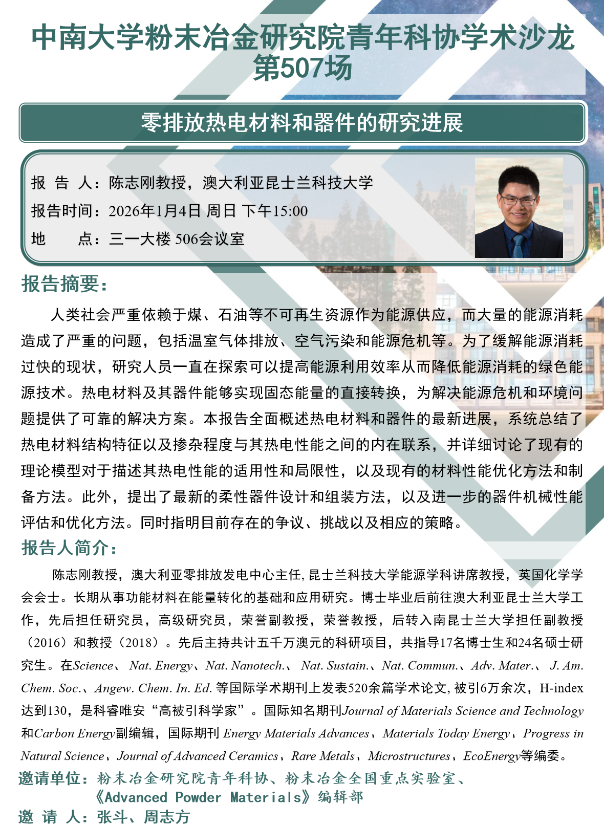 陈志刚教授,澳大利亚零排放发电中心主任,昆士兰科技大学能源学科讲席教授,英国化学学会会士。长期从事功能材料在能量转化的基础和应用研究。博士毕业后前往澳大利亚昆士兰大学工作,先后担任研究员,高级研究员,荣誉副教授,荣誉教授,后转入南昆士兰大学担任副教授(2016)和教授(2018)。先后主持共计五千万澳元的科研项目,共指导17名博士生和24名硕士研究生。在Science、Nat.Energy、Nat. Nanotech.、Nat. Sustain.、Nat.Commun.、Adv, Mater.、J. AmChem. Soc.、ngew.Chem.In.Ed,等国际学术期刊上发表520余篇学术论文,被引6万余次,H-index达到130,是科睿唯安“高被引科学家”。国际知名期刊JournalofMaterials Science and Technolog和Carbon Energy副编辑,国际期刊Energy Materials Advances、Materials Today Energy,Progress inNatural Science、JournalofAdvanced Ceramics,Rare Metals、Microstructures、EcoEnergy等编委。