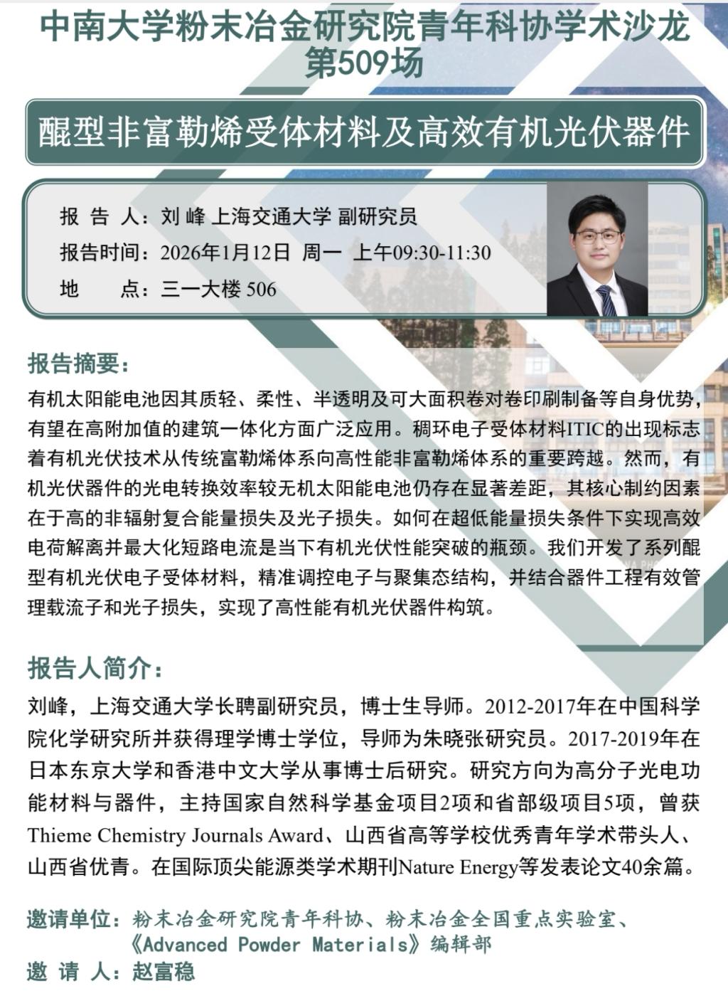 刘峰,上海交通大学长聘副研究员,博士生导师。2012-2017年在中国科成人app化学研究所并获得理学博士学位,导师为朱晓张研究员。2017-2019年在日本东京大学和香港中文大学从事博士后研究。研究方向为高分子光电功能材料与器件,主持国家自然科学基金项目2项和省部级项目5项,曾获Thieme Chemistry Journals Award、山西省高等学校优秀青年学术带头人山西省优青。在国际顶尖能源类学术期刊Nature Energy等发表论文40余篇