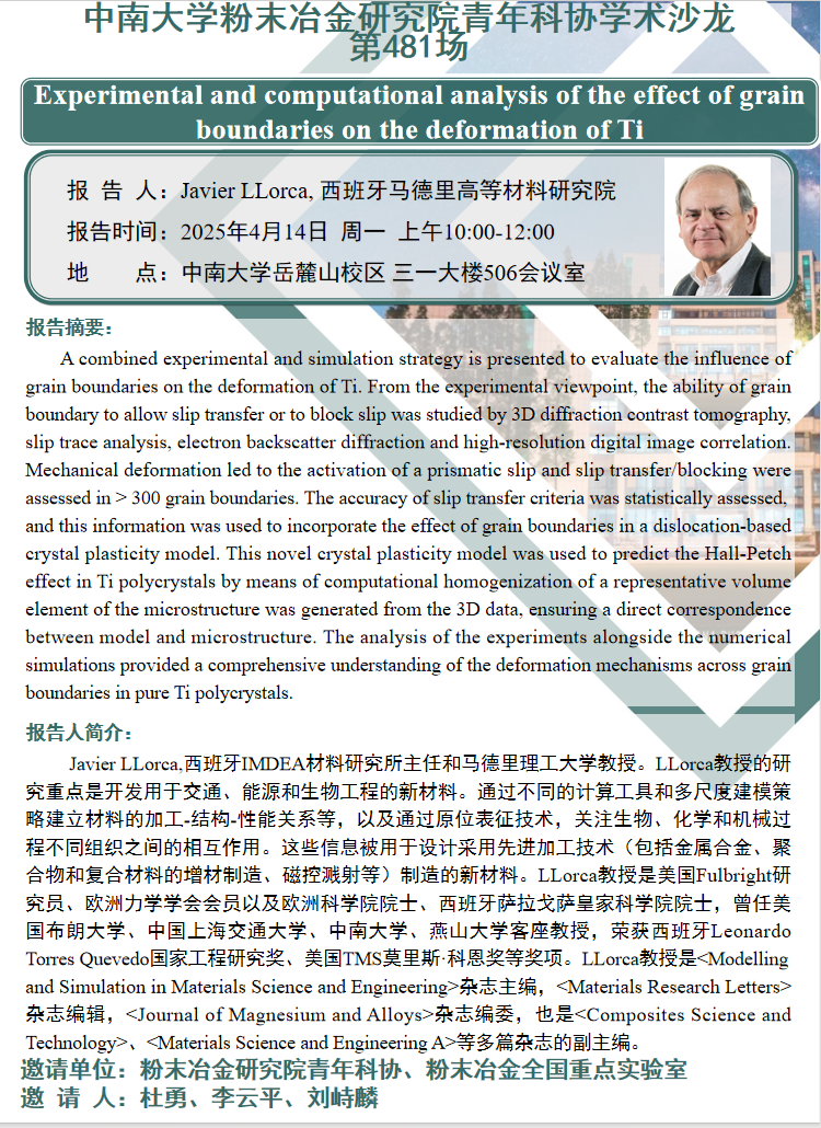时间:2025年4月14日 10:00地 点:三一大楼506报告摘要:A combined experimental and simulation strategy is presented to evaluate the influence ofgrain boundaries on the deformation of Ti. From the experimental viewpoint, the ability of grainboundary to allow slip transfer or to block slip was studied by 3D diffraction contrast tomography;lip trace an...