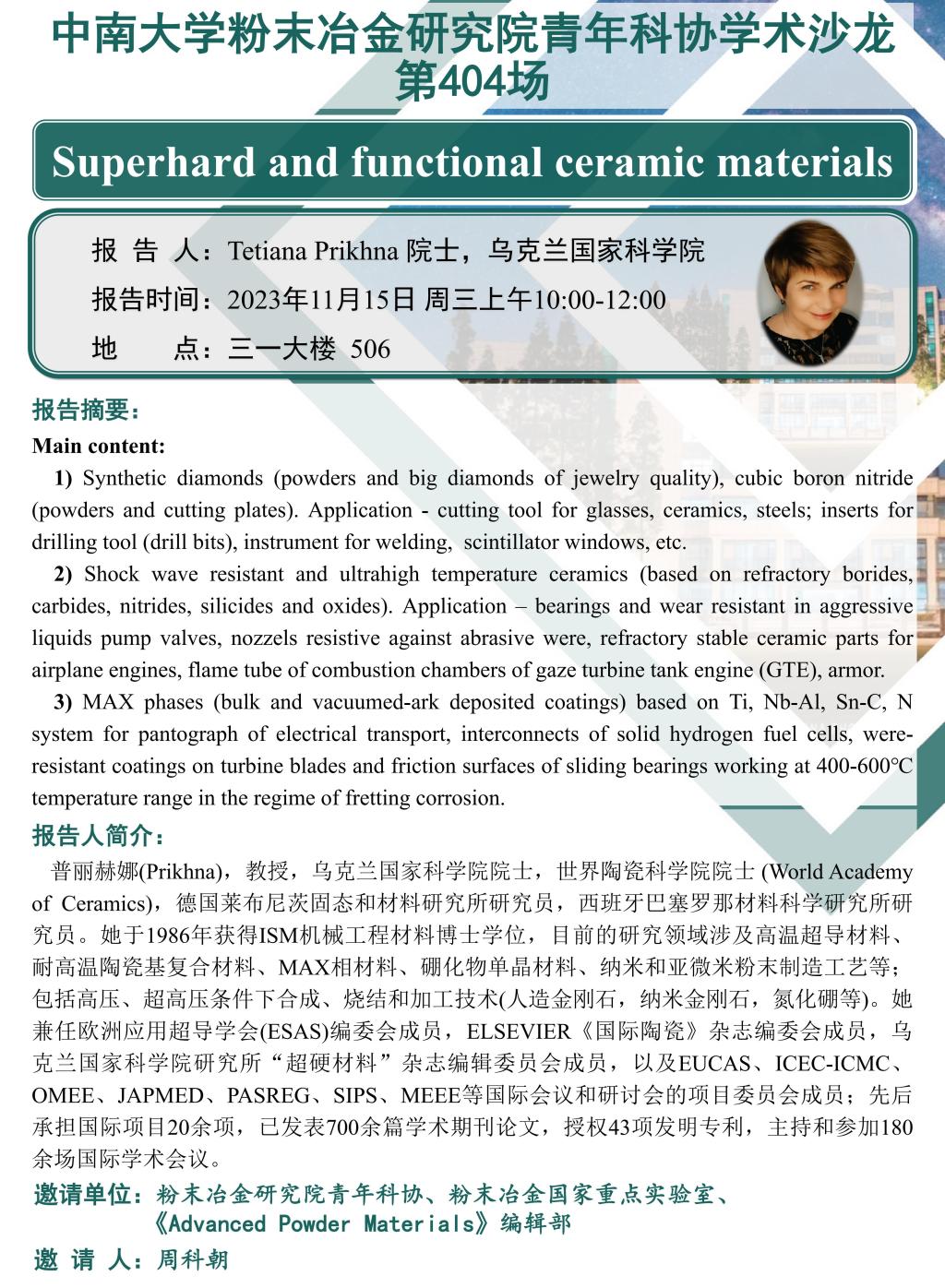 报 告 人:Tetiana Prikhna 院士,乌克兰国家科成人app报告时间:2023年11月15日 周三10:00-12:00地点:三一大楼506报告摘要:Main content:1)Synthetic diamonds (powders and big diamonds of jewelry quality), cubic boron nitride(powders and cutting plates). Application - cutting tool for glasses, ceramics, steels; inserts for drilling tool (drill bits), instrument for welding, scintillator windows, etc.2)Sh...